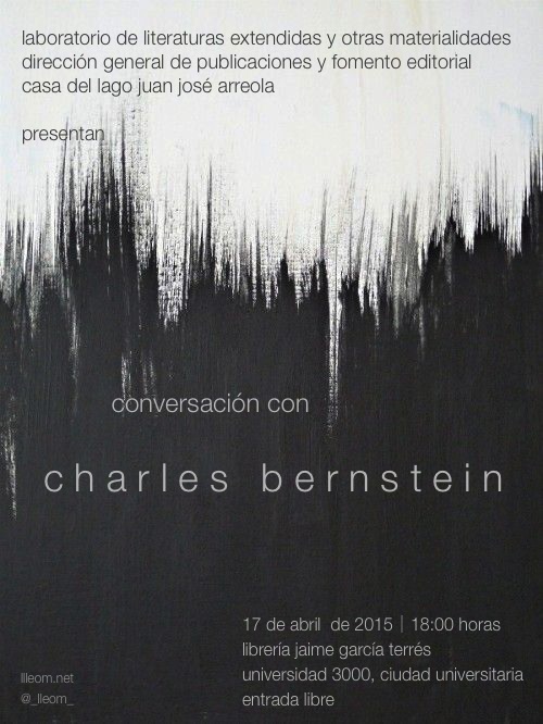 En el marco del Festival Poesía en voz alta 2015 y en colaboración con la Dirección de Publicaciones y Fomento Editorial de la UNAM y con la Casa del Lago Juan José Arreloa, el laboratorio de literaturas extendidas y otras materialidades (lleom) organizó una conversación con el escritor y crítico norteamericano Charles Bernstein el viernes 17 de abril a las 18:00 horas en la librería universitaria Jaime García Terrés.