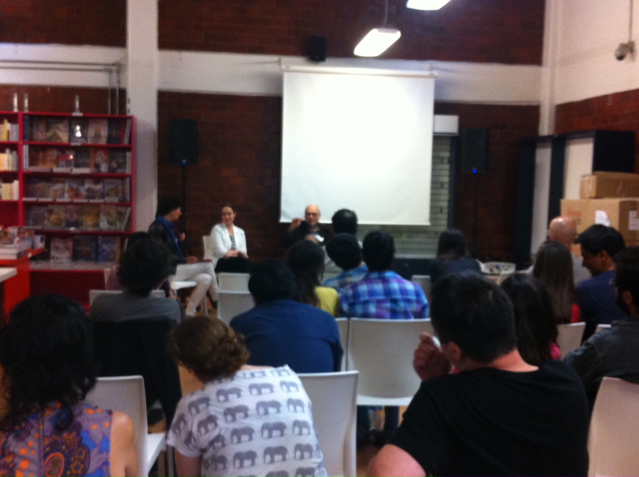La conversación estuvo dirigida por las integrantes de lleom, Susana González Aktories y MAría Andrea Giovine. Durante la charla, Bernstein habló de cómo piensa críticamente la materialidad sonora de la poesía, cómo la posibilidad de grabar sonidos, en especial la lectura de poesía, cambió nuestra manera de entender lo poético. Además contó la historia del archivo PennSound, que él coordina.